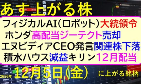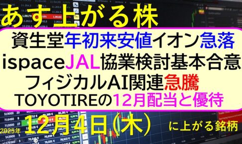 資生堂年初来安値、イオン急落。ispaceとJAL協業検討基本合意。フィジカルAI関連株が急騰。TOYOTIREの12月配当と優待 ~あす上がる株。最新の日本株情報。高配当株の株価やデイトレ情報~ ★YouTubeメンバ…