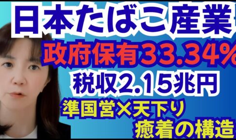 政権電論TV「JTの真実と投資家の視点」 政権電論TVで佐藤尊徳氏と井川意高氏が語った JT(日本たばこ産業)の構造を紹介 データ ✅ 政府保有比率:33.34%(財務大臣) ✅ たばこ税収:…