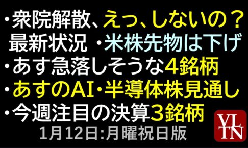 衆院解散、えっ、しないの?最新状況。 あす急落しそうな4銘柄。あすのAI・半導体株見通し。今週注目の決算3銘柄。決算スケジュール2週間分1月12日(月曜・祝日)高市氏関連銘柄、選挙関連銘柄。~あす上がる株。最新の日本株情…