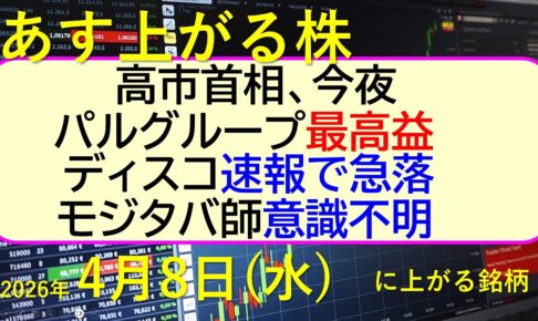 高市首相、今夜。パルグループが最高益。ディスコは速報で急落。モジタバ師が意識不明。 ~あす上がる株。~最新の日本株情報。高配当株の株価やデイトレ情報~ ★YouTubeメンバーシップへの参加リンク ◆メンバーシップのご説…