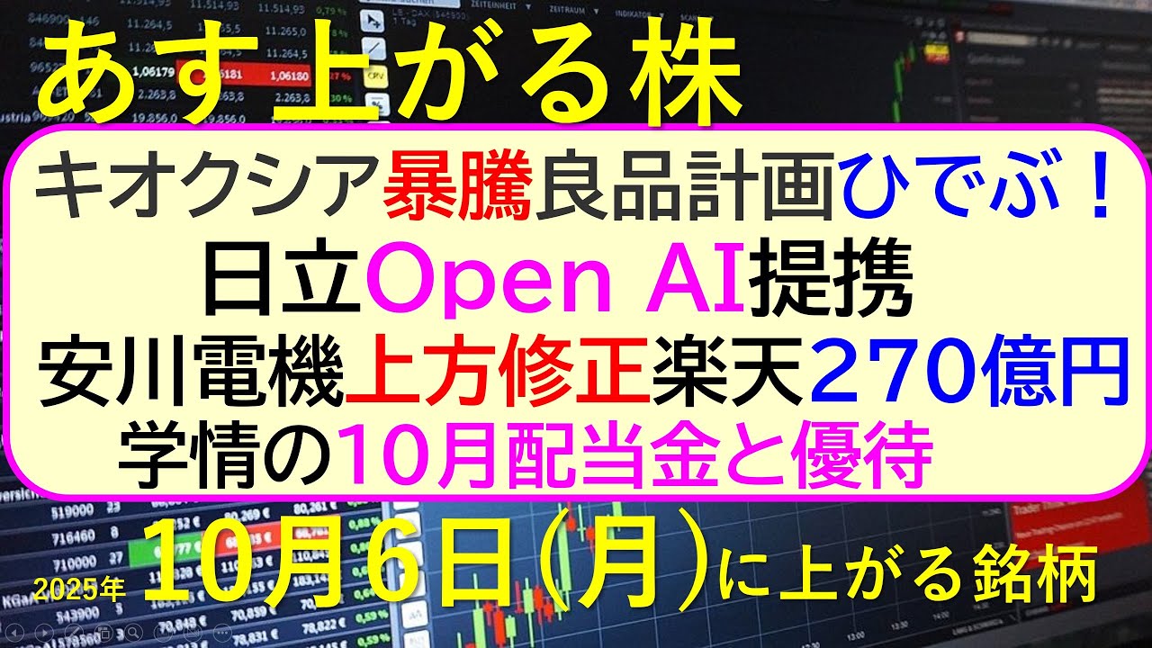 安川電機上方修正。日立Open AI提携。楽天270億円減損。学情の10月配当金と優待