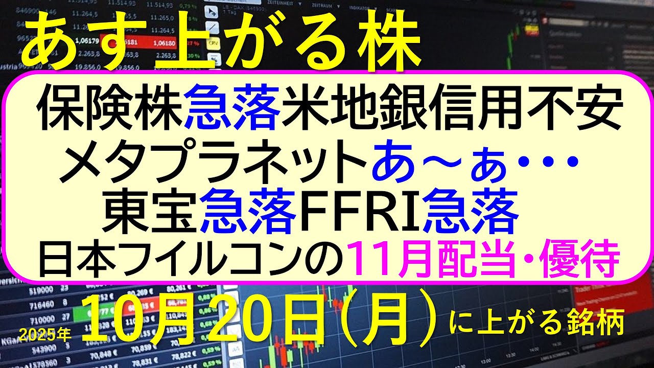 保険株が急落、米地銀の信用不安。東宝急落、FFRI急落。メタプラネットあ~ぁ・・・。日本フイルコンの11月配当・優待。