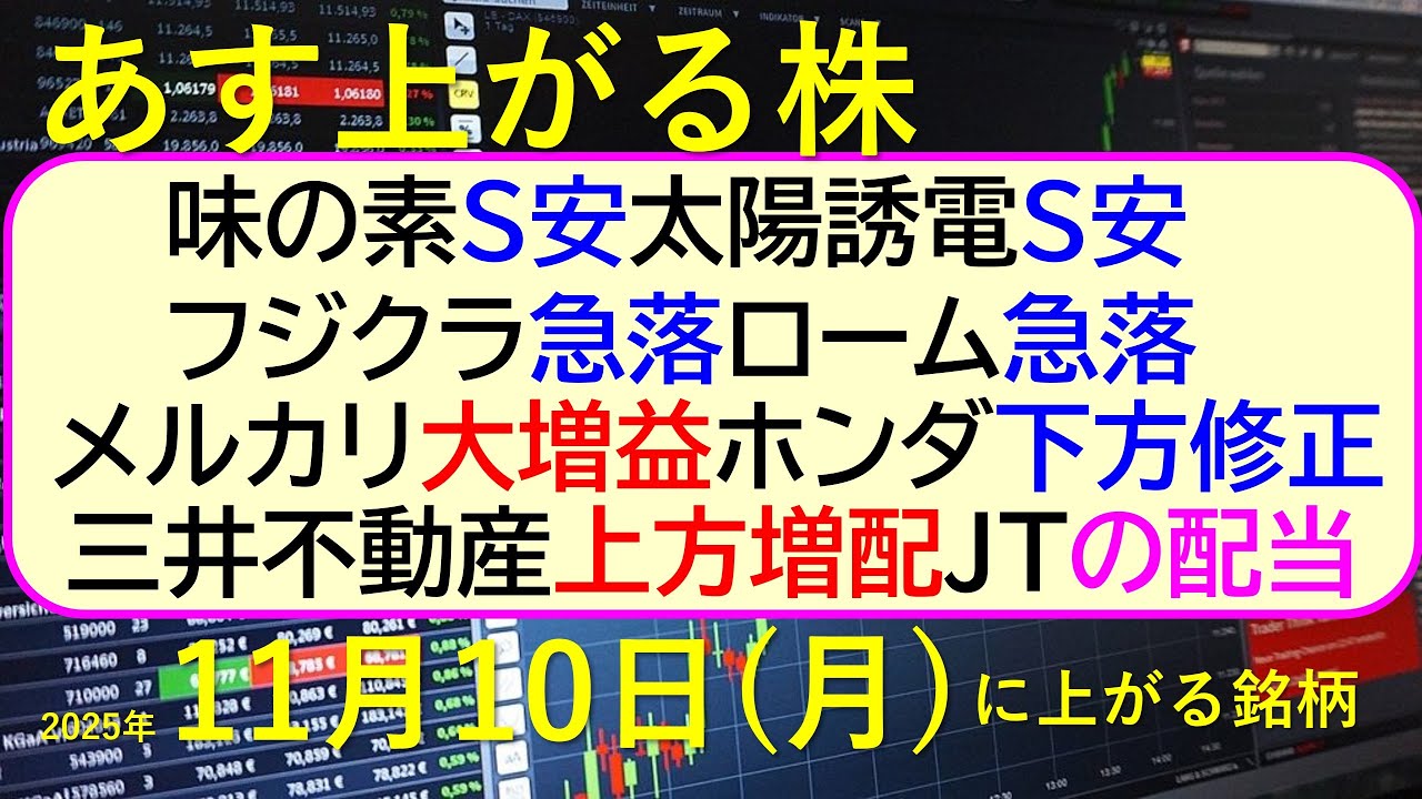 味の素S安。太陽誘電S安。フジクラ急落。ローム急落。メルカリ大増益。ホンダ下方修正。三井不動産上方増配、JTの配当