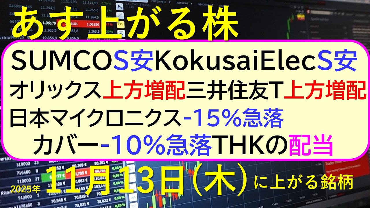 あす上がる株 2025年11月13日(木)に上がる銘柄。SUMCOストップ安。オリックス上方増配三井住友T上方増配。日本マイクロニクス急落。カバー急落~最新の日本株情報。高配当株の株価やデイトレ情報~