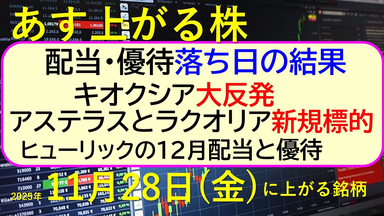 あす上がる株 2025年11月28日(金)に上がる銘柄。配当・優待落ち日の結果。キオクシア大反発。アステラスとラクオリア新規標的。ヒューリックの配当~最新の日本株情報。高配当株の株価やデイトレ情報~