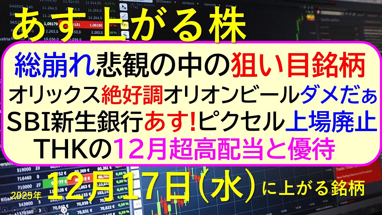 オリックス絶好調。SBI新生銀行あす!。ピクセル上場廃止。オリオンビールダメだぁ・・・。THKの12月配当。