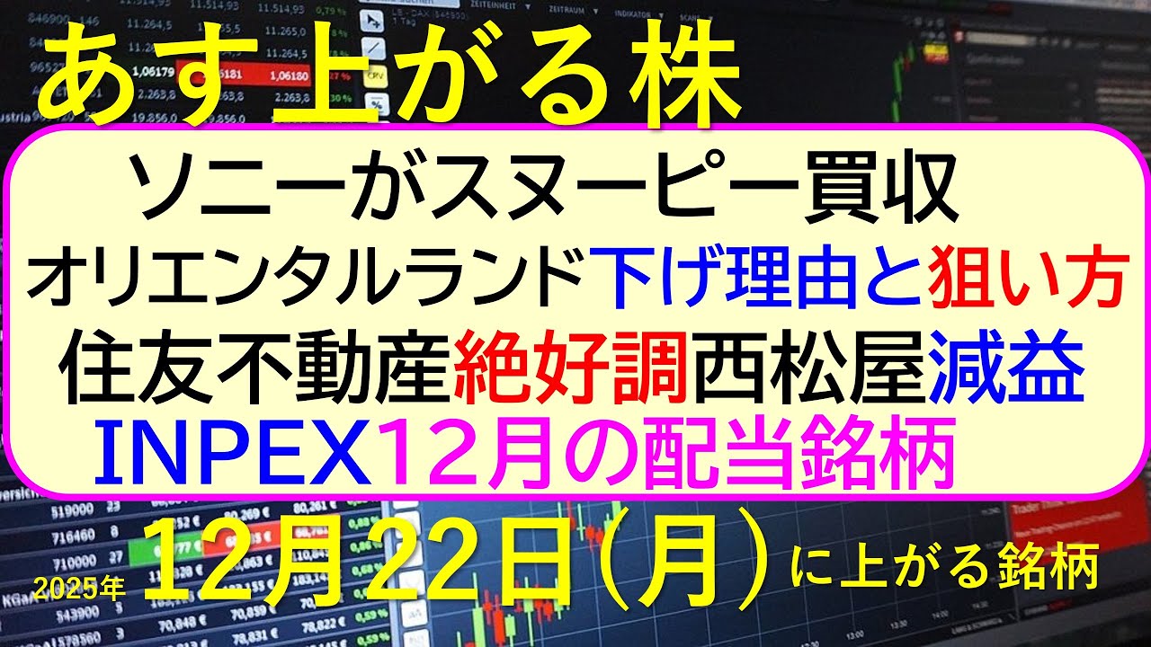 ソニーがスヌーピー買収。オリエンタルランド下げ理由と狙い方。住友不動産絶好調。西松屋減益。INPEXの12月配当