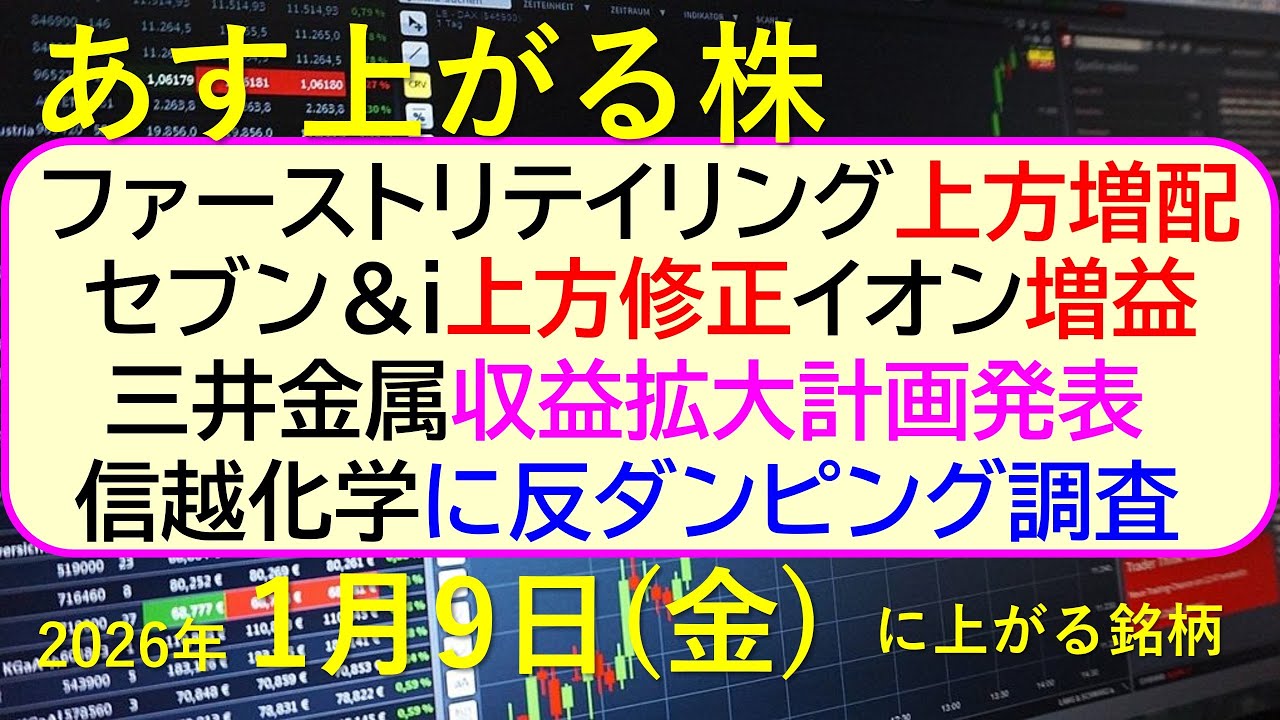 ファーストリテイリング上方修正・増配。セブン&i上方修正。イオン増益。三井金属が収益拡大計画発表。信越化学に反ダンピング調査。