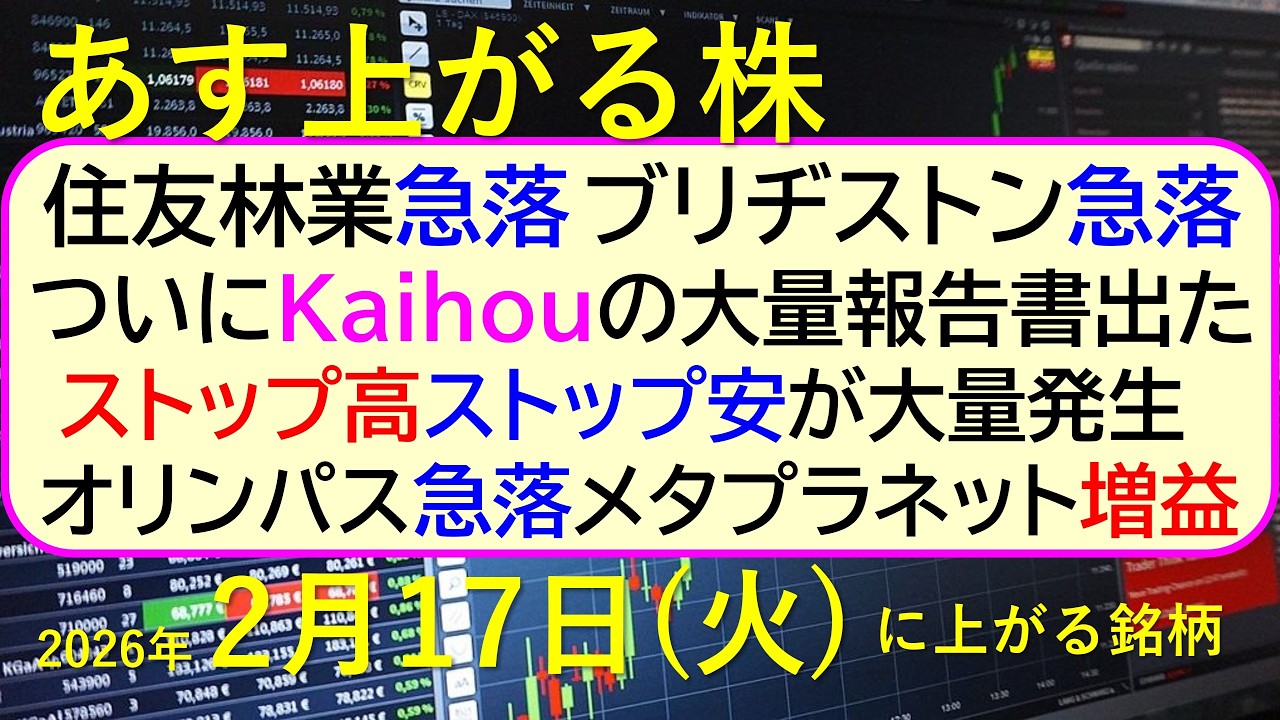 住友林業急落。ブリヂストン急落。Kaihouの大量報告書。S高S安大量発生。オリンパス急落。メタプラネット増益。~あす上がる株 2026年2月17日(火)に上がる銘柄。~最新の日本株情報高配当株の株価やデイトレ情報~