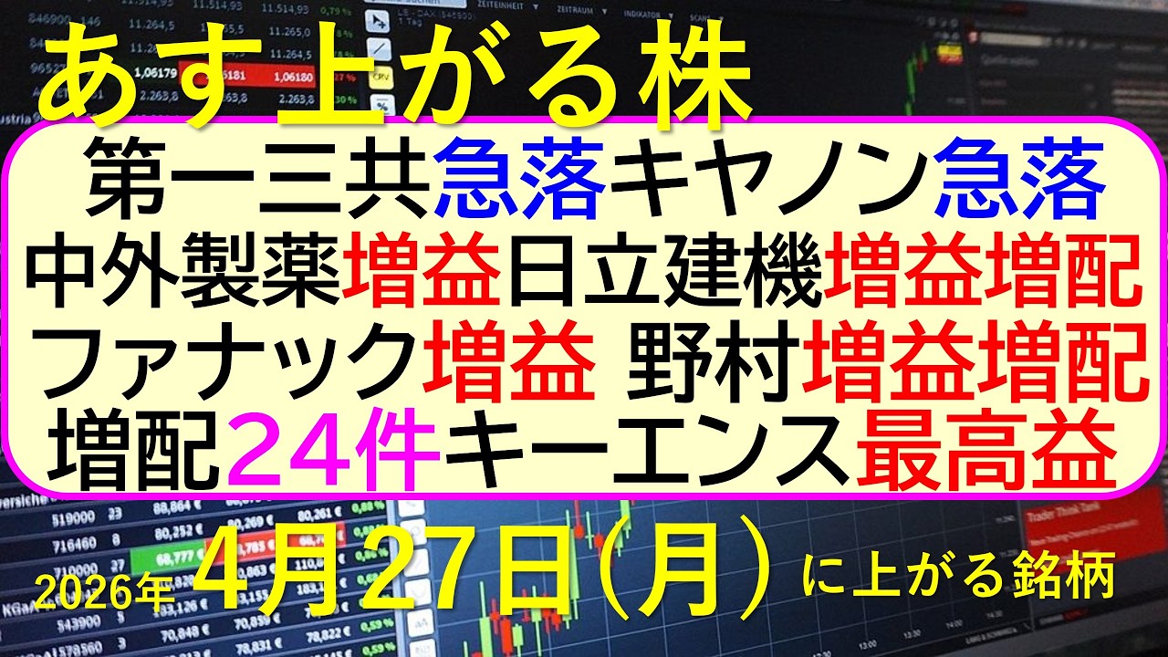第一三共急落。キヤノン急落。中外製薬増益。日立建機増益増配。ファナック増益。野村増益増配。キーエンス最高益。増配24件。