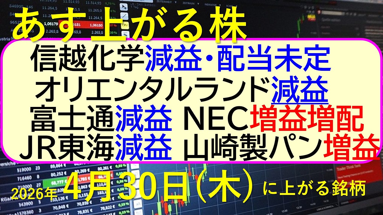 信越化学減益・配当未定。オリエンタルランド減益。富士通減益。NEC増益増配。JR東海減益。山崎増益~あす上がる株 2026年4月30日(木)に上がる銘柄。最新の日本株情報。高配当株の株価やデイトレ情報