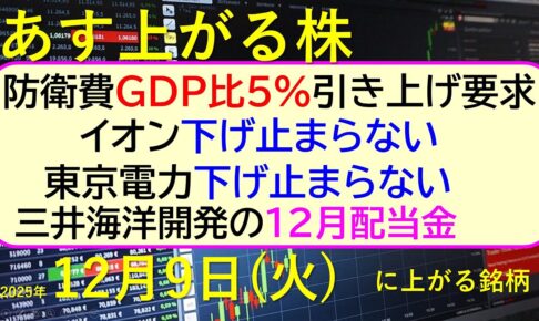 防衛費GDP比5%引き上げ要求。イオン下げ止まらない。東京電力下げ止まらない。三井海洋開発の12月配当金 ~あす上がる株。最新の日本株情報。高配当株の株価やデイトレ情報~ ★YouTubeメンバーシップへの参加リンク ◆…