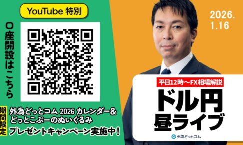 本ライブ配信視聴者限定!下記の条件を達成した方へもれなく『外為どっとコム2026カレンダー』と「ミニどっとこぶーのぬいぐるみ」をプレゼントいたします。 <条件> ・2026年1月13日(火)午前7時10分~2026年1月…