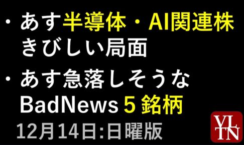 あす半導体・AI関連株きびしい局面。あす急落しそうなBadNews5銘柄。決算スケジュール2週間分。12月14日(日曜版) ~あす上がる株。最新の日本株情報。高配当株の株価やデイトレ情報~ ★YouTubeメンバーシップ…