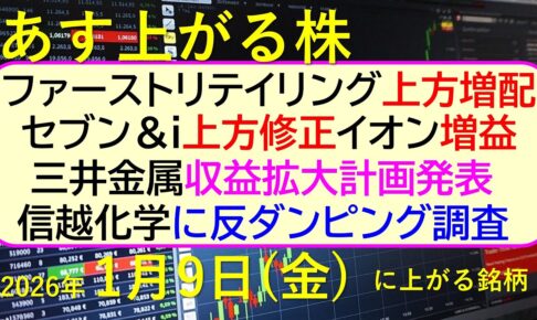 ファーストリテイリング上方修正・増配。セブン&i上方修正。イオン増益。信越化学に反ダンピング調査~あす上がる株 2026年1月9日(金)に上がる銘柄。~最新の日本株情報。高配当株の株価やデイトレ情報~