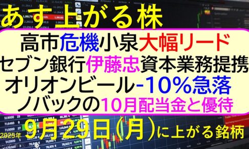 高市危機、小泉大幅リード。セブン銀行伊藤忠、資本業務提携。オリオンビール、-10%急落。ノバックの10月配当金と優待。 ~あす上がる株。最新の日本株情報。高配当株の株価やデイトレ情報~ ★総裁選アンケート ★YouTub…