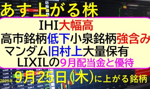 IHI大幅高。高市銘柄低下小泉銘柄強含み。マンダム旧村上大量保有。LIXILの9月配当金と優待 ~あす上がる株。最新の日本株情報。高配当株の株価やデイトレ情報~ ★YouTubeメンバーシップへの参加リンク ◆メンバーシ…