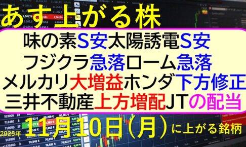 あす上がる株 2025年11月10日(月)に上がる銘柄。味の素、太陽誘電S安。フジクラ急落。ローム急落。メルカリ増益。ホンダ下方。三井不動産上方増配。~最新の日本株情報。高配当株の株価やデイトレ情報~