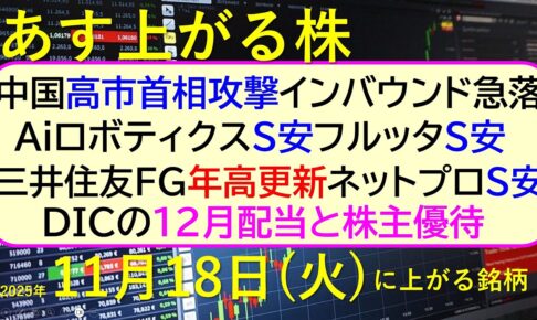 中国高市首相攻撃、インバウンド急落。AiロボティクスS安。フルッタS安。三井住友FG年高更新。ネットプロS安。DICの12月配当と株主優待。 ~あす上がる株。最新の日本株情報。高配当株の株価やデイトレ情報~ ★YouTu…