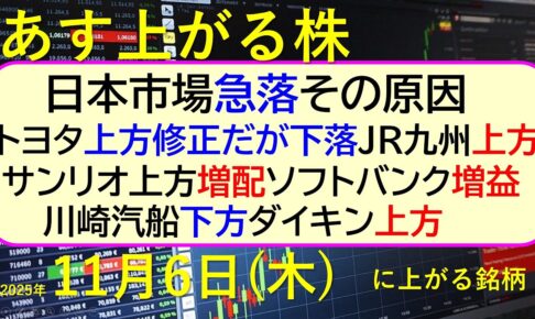 トヨタ上方修正で下落。JR九州上方。サンリオ上方増配。ソフトバンク増益。川崎汽船下方。ダイキン上方。 ~あす上がる株。最新の日本株情報。高配当株の株価やデイトレ情報~ ★YouTubeメンバーシップへの参加リンク ◆メン…