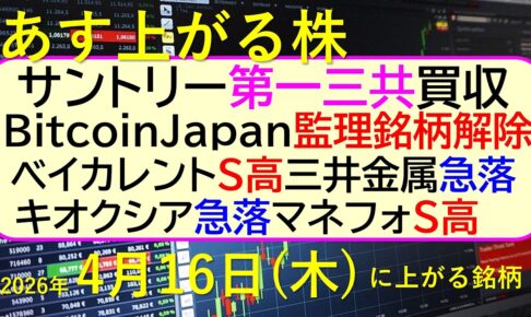 サントリーが第一三共を買収。BitcoinJapan、監理銘柄解除。ベイカレントS高。三井金属急落。キオクシア急落。マネフォワードS高。 ~あす上がる株。~最新の日本株情報。高配当株の株価やデイトレ情報~ ★YouTub…